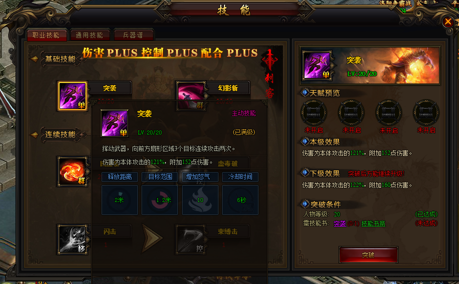 当技能达到一定等级后将无法进行升级,需要再次使用技能书进行突破,突破后的技能将会大幅提升该技能的附带效果几率,并会提升技能伤害