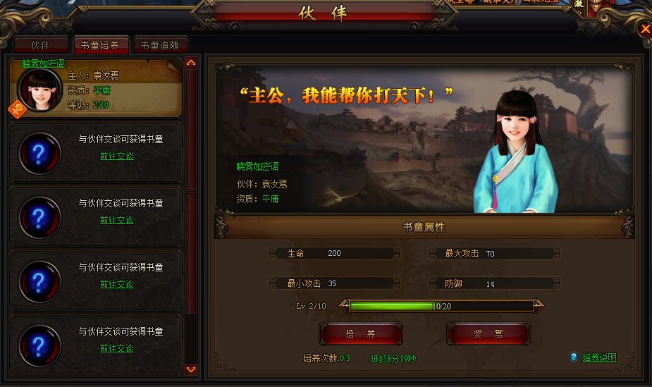 听说只要跟伙伴的亲密度越高,越容易赏赐书童,而且书童的天资也会越高!
