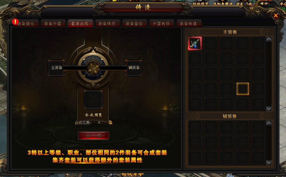 3转以上的装备可以通过套装合成功能合成套装,需要两件相同的装备合成,合成时选择主装备与辅装备,合成后会继承主装备的所有附带属性(升星,鉴定属性)