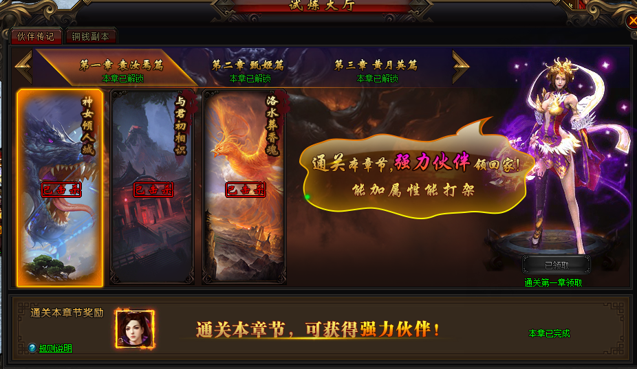 伙伴副本共5章,每通关一章都会获得一个伙伴,越靠后的伙伴越厉害哦!