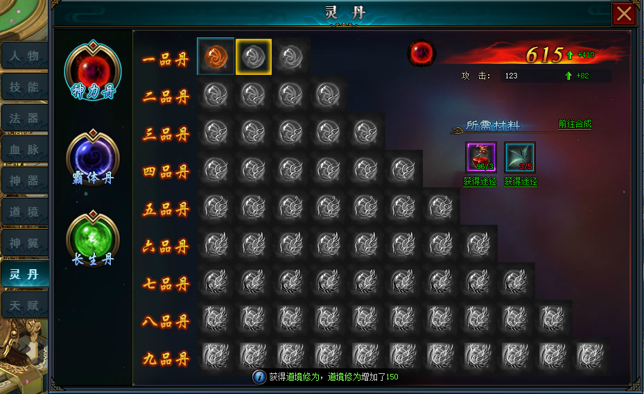 玩家在闯天关的路上,会获得各种灵丹材料