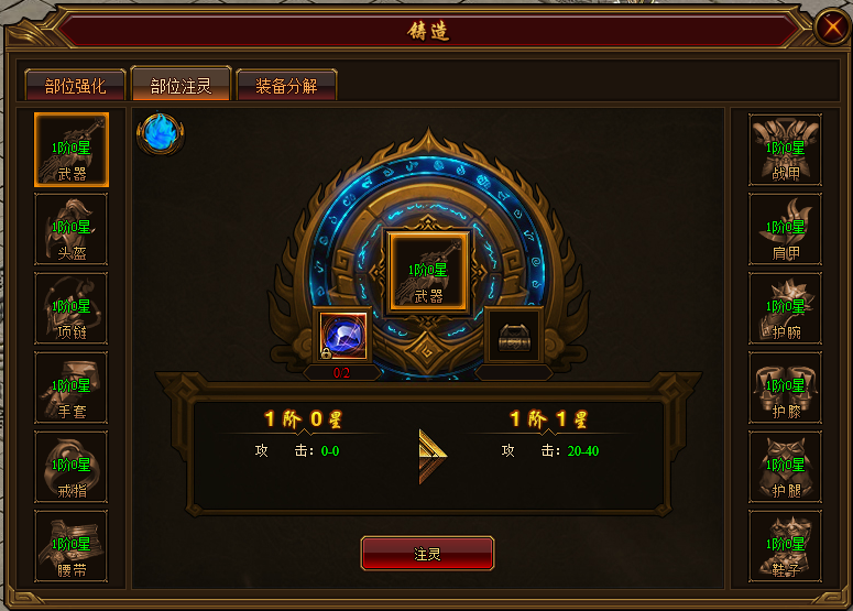 注灵会提升该装备位的装备属性,当部位没有装备时不生效!
