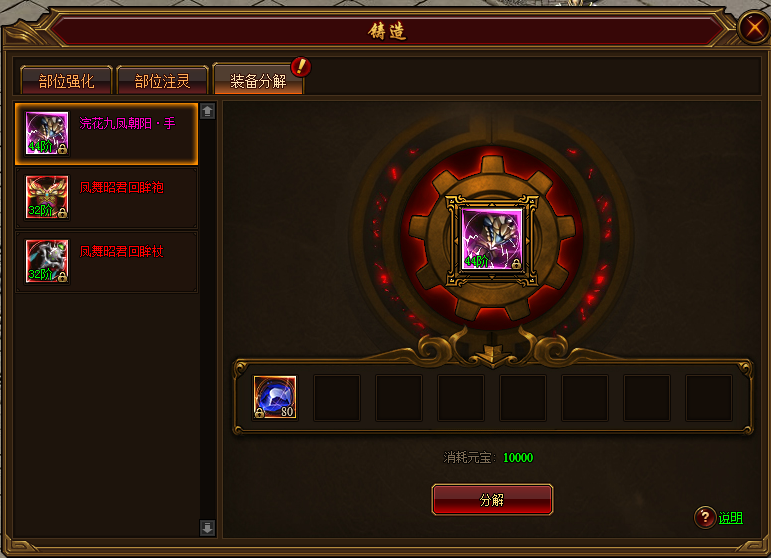 在游戏铸造-分解可打开分解系统界面、系统会自动筛选出您当前背包内的低于身上属性的装备可选择分级操作,不同的装备分解获得的材料不同