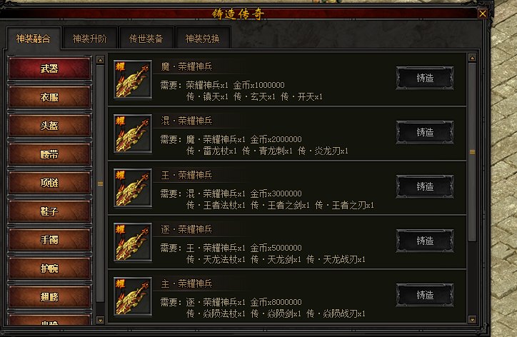 点击锻造师可以打开传世装备的合成界面,