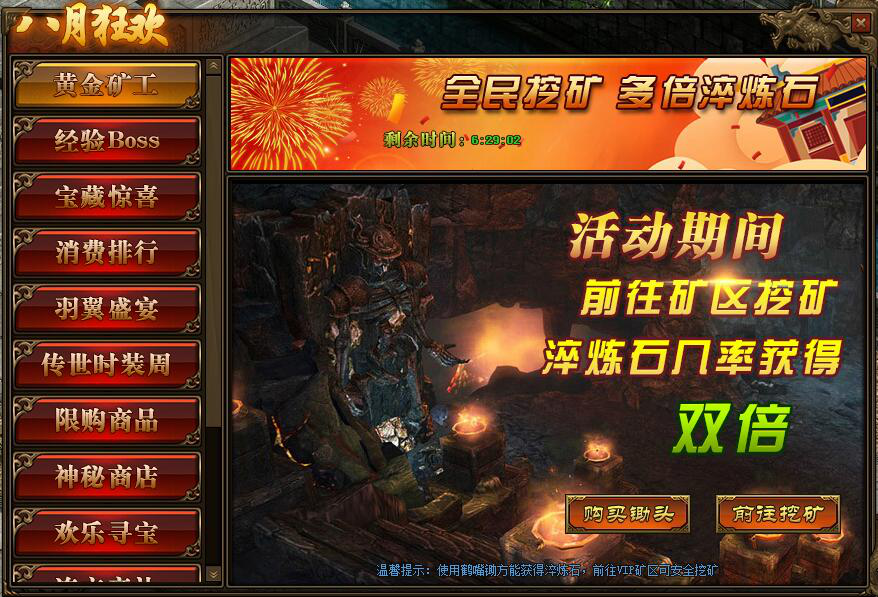 2.注意:必须使用“鹤嘴锄”才可获得“淬炼石”,在VIP矿区可安全挖矿;