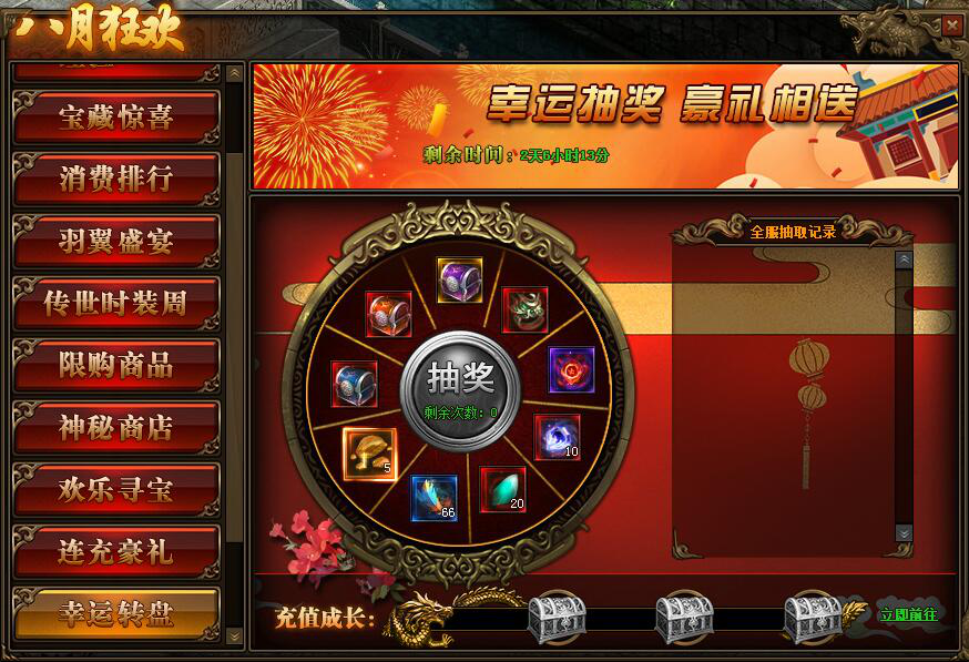 1.活动期间内,每日充值可增加充值成长值,达到一定充值成长值后可领取抽奖次数,每日最多获得3次抽奖机会;