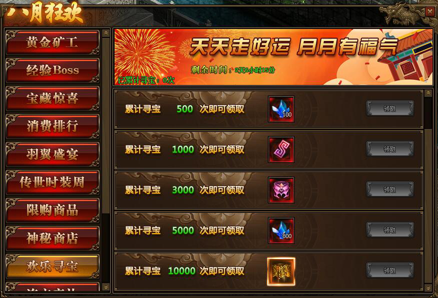 1.活动期间,玩家累计寻宝次数满足要求,可以领取本职业仙装、本职业星石、传世灵器·仙带等相应奖励;