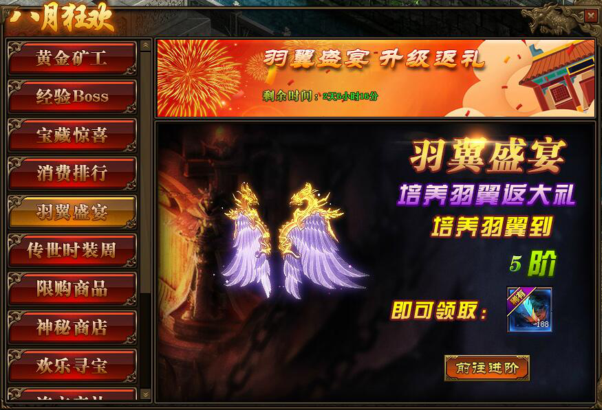 1.活动期间,玩家羽翼只需达到5级,即可领取一定数量的羽毛;