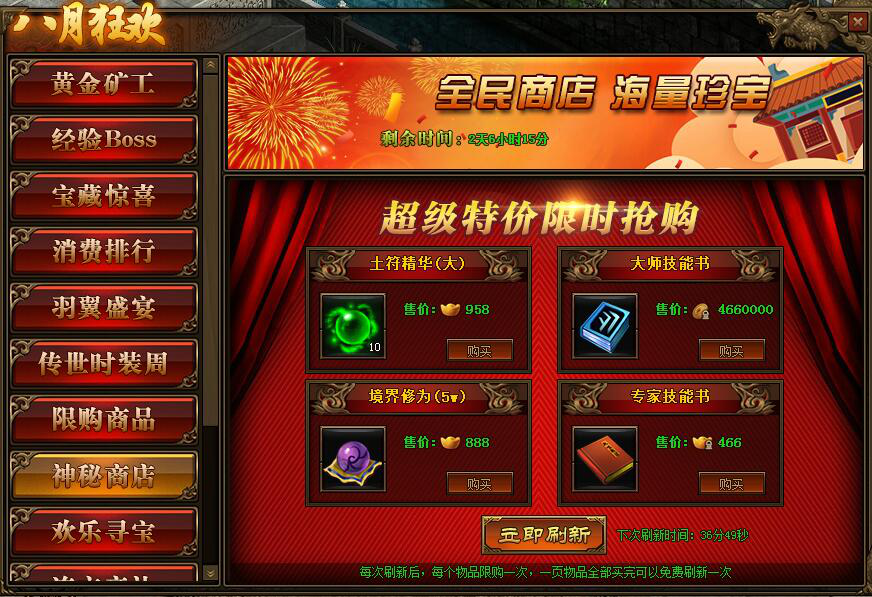 1.活动期间,玩家可在神秘商店中购买商品,商品可用金币,绑元,元宝进行购买;