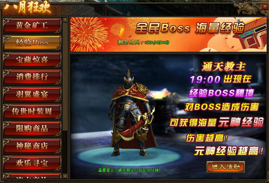 2.活动中,玩家对BOSS造成的伤害,将在活动结束后转换成元神经验并发放;