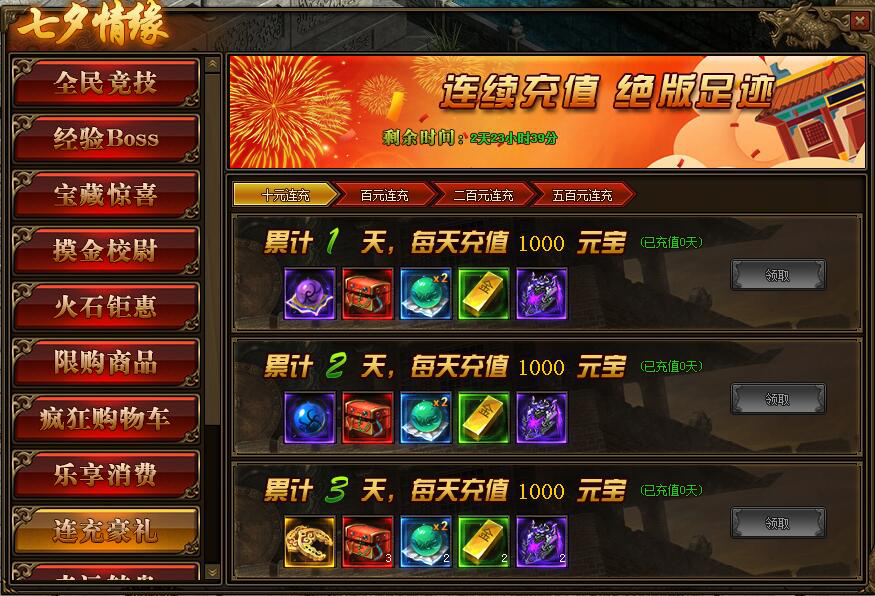 1.活动期间,每天充值10元、100元、200元、500元可领取境界修为、特戒礼盒。