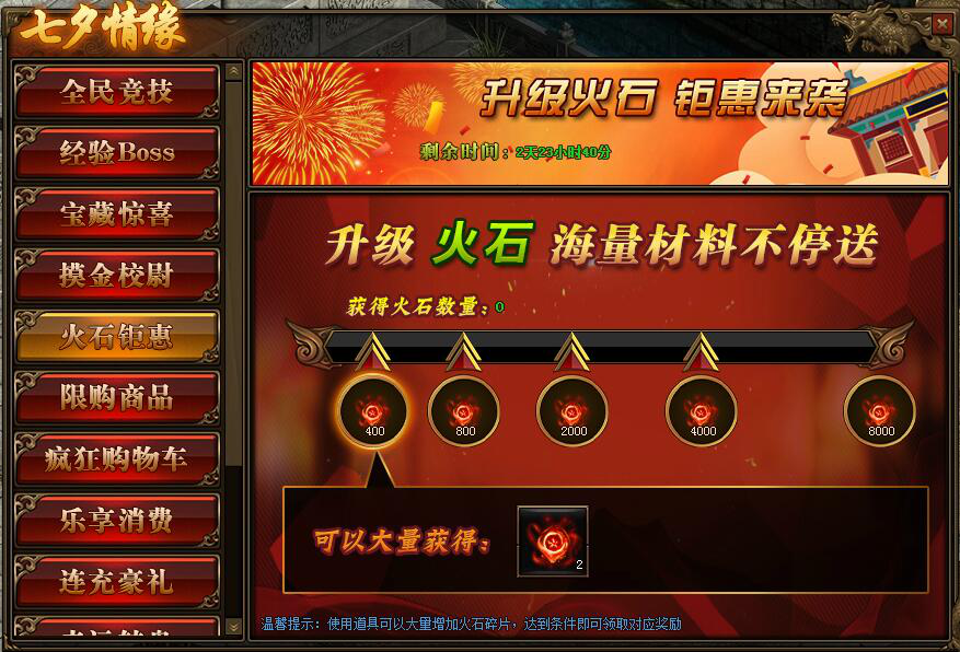 1. 活动期间,玩家获得火石碎片数量,达到条件可领取对应火石碎片奖励。
