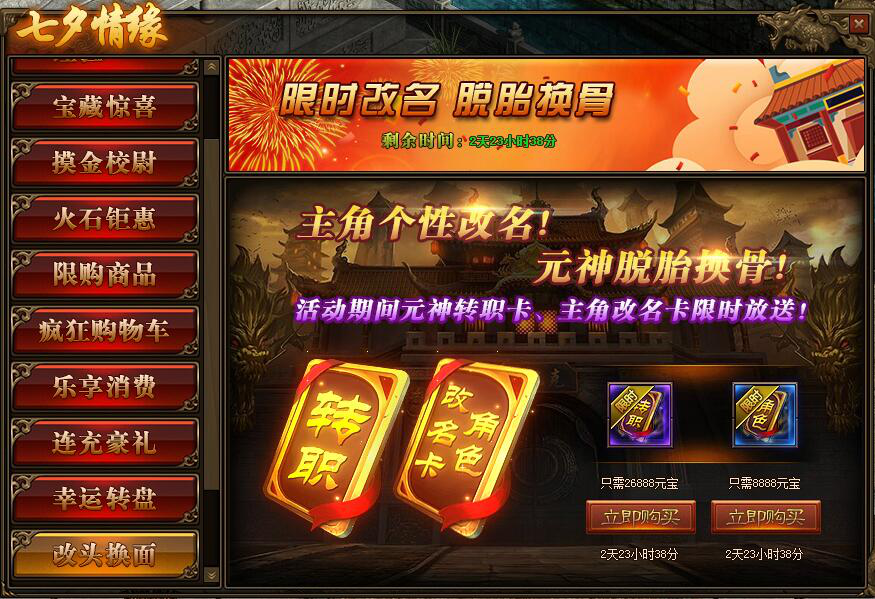 1.活动期间,玩家可在活动面板中购买元神转职卡,让元神脱胎换骨;