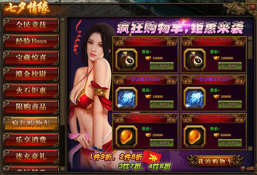 1.活动期间,玩家可在将碧落星空、龙纹福袋等物品放入我的购物车;