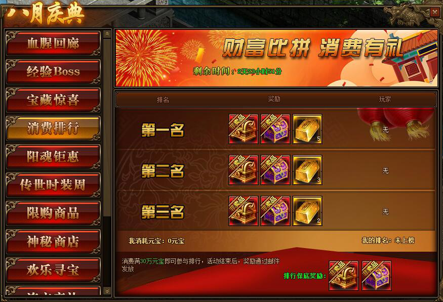 1.活动期间,玩家消费满30万元宝参与排行
