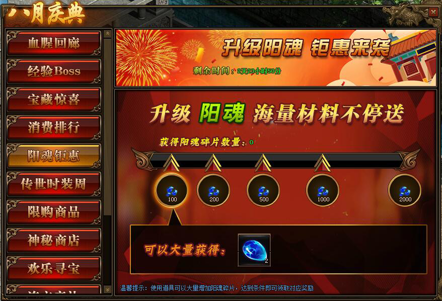 1. 活动期间,玩家获得阳魂碎片数量,达到条件可领取对应阳魂碎片奖励。