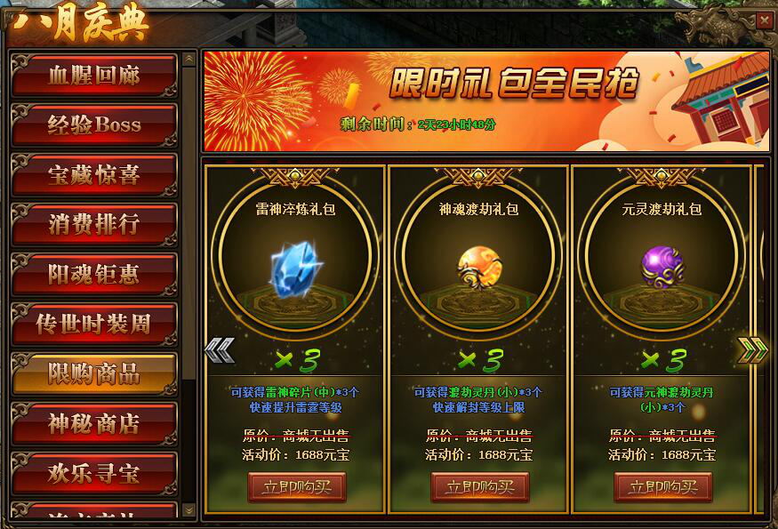 1.活动期间,玩家可在活动面板购买限购商品;(可翻页)