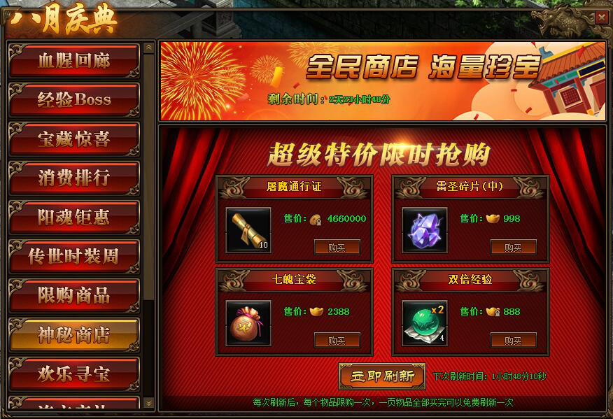 2.神秘商店每2小时自动刷新一次,也可用花费元宝立即刷新;