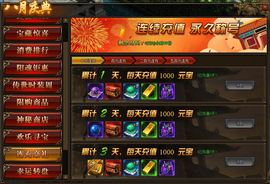 2.累积充值达到三天,可领取稀有称号