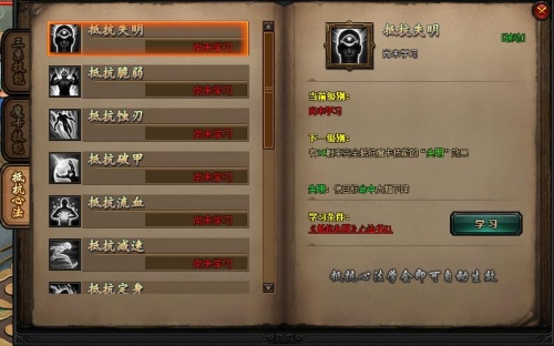 抵抗心法:当角色拥有对应心法书后,可学习对应抵抗心法。
