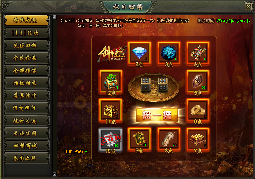 活动说明:活动期间内,每日登陆游戏即可免费投掷筛子一次,根据投掷的点数领取奖励