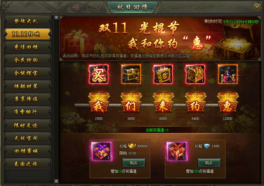 活动说明:活动期间,购买节日礼包可获得祝福值,祝福值达到指定额度可领取超值奖励