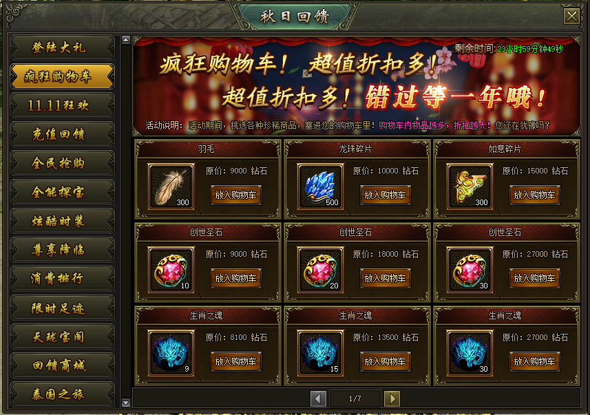 活动说明:活动期间,挑选各种珍稀物品,塞进购物车,购物车内物品越多,折扣越大