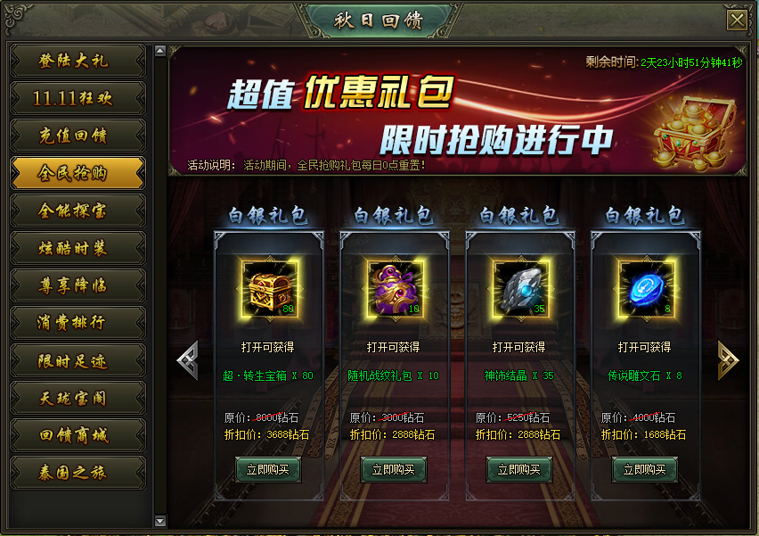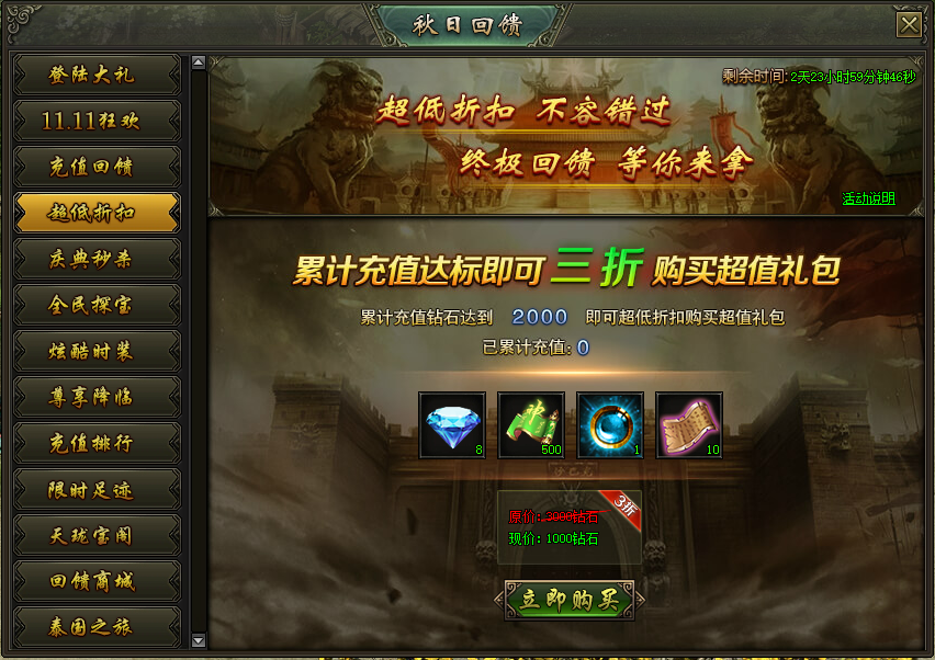 活动说明:活动期间,累计充值达到指定额度,即可购买超低折扣礼包