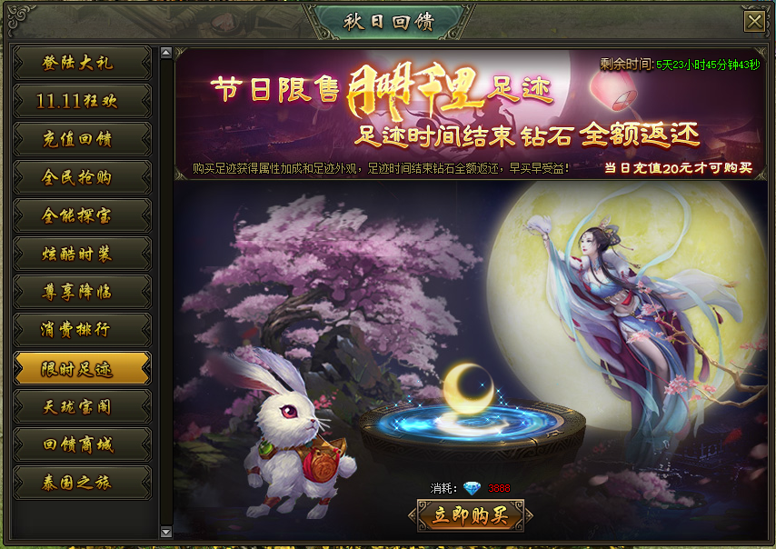 活动说明:活动期间,限时售卖月明千里足迹,活动结束后钻石全额返还