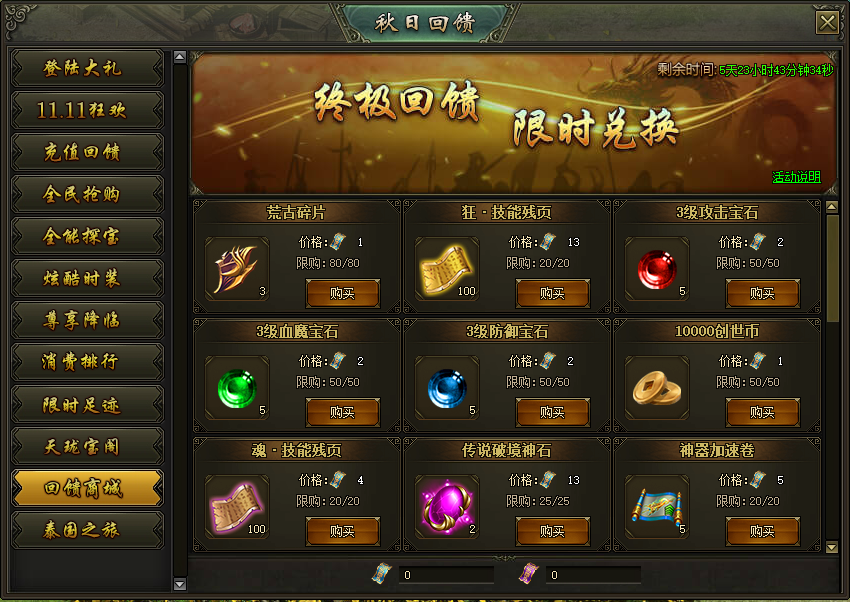 活动说明:活动期间,可使用充值回馈卷和消费回馈卷兑换大量奖励