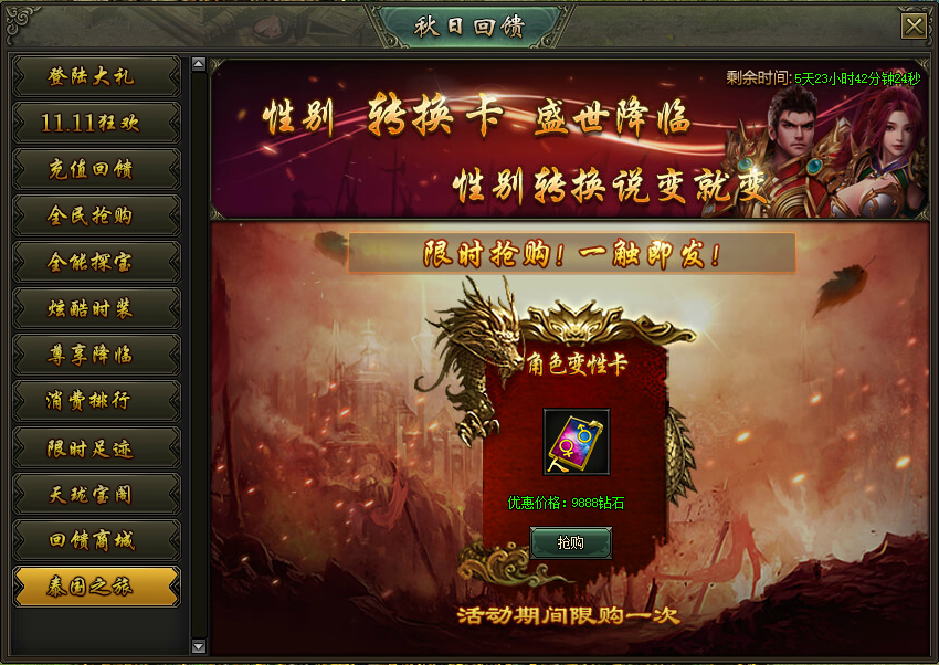 活动说明:活动期间,限时售卖角色变性卡