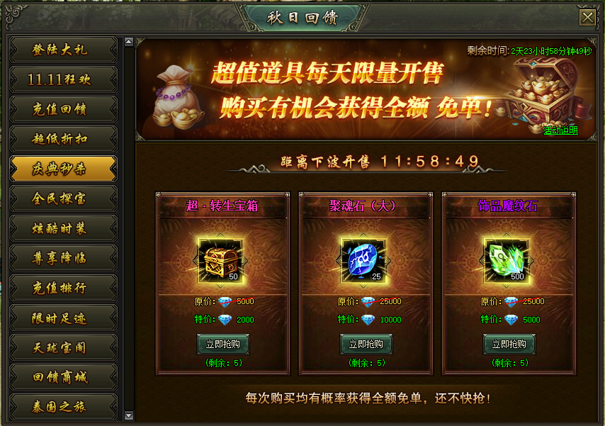 活动说明:活动期间,超值道具每天限量开售,购买就有机会获得全额免单!