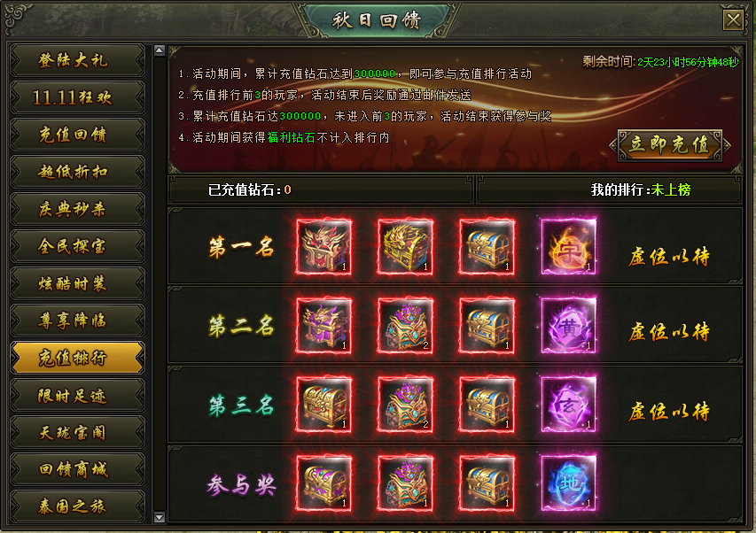 活动说明:活动期间,累计充值达到300000钻石的玩家参与排行,上榜的玩家奖励在活动结束后以邮件的方式进行发放