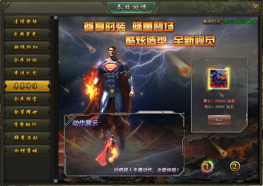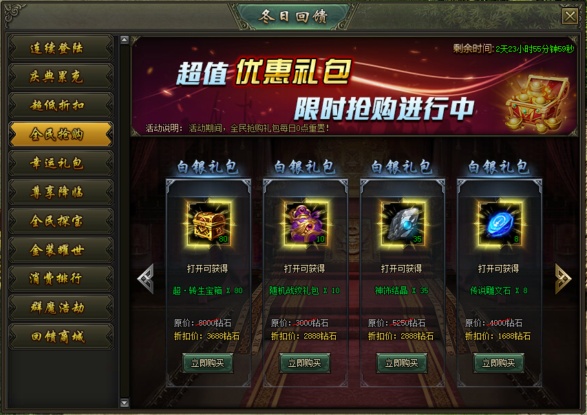 活动说明:活动期间,累计充值一定钻石即可超低折扣购买礼包