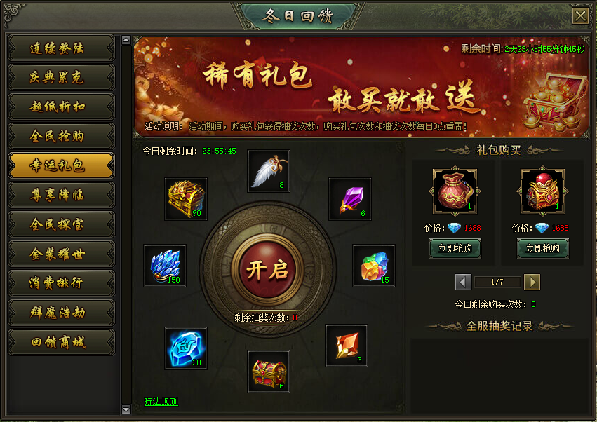 活动说明:活动期间,购买礼包获得抽奖次数,购买礼包次数和抽奖次数每日0点重置。