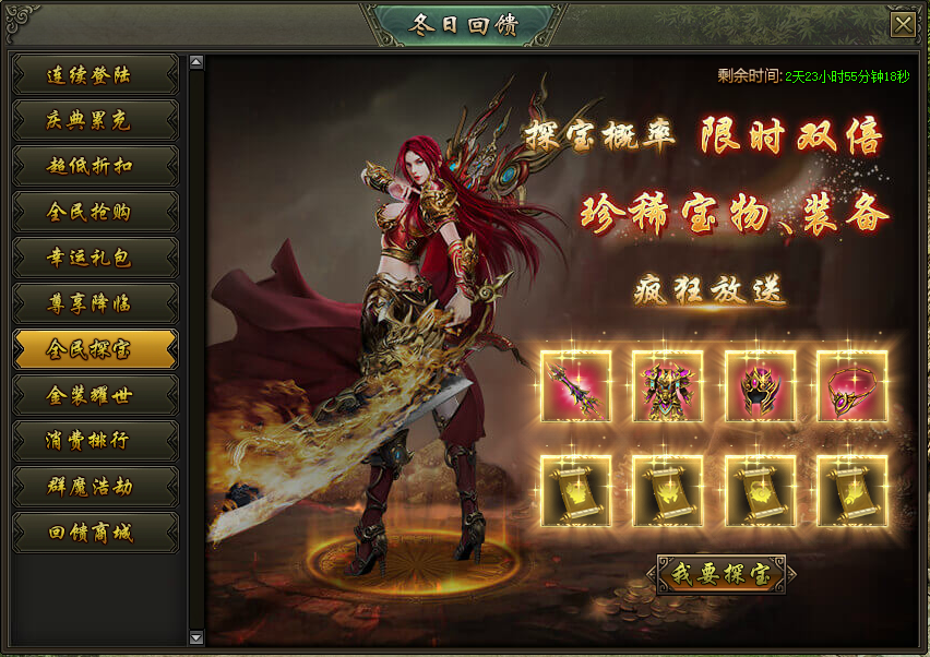 活动说明:活动期间,龙之宝藏产出圣装的概率限时翻倍,极品圣装、珍稀宝物大放送!