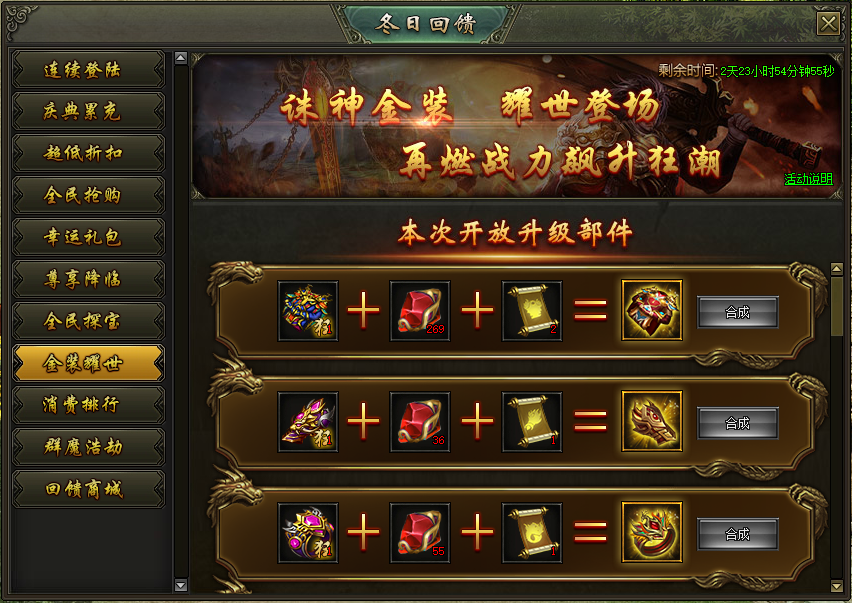 活动说明:活动期间,诛神金装耀世登场,穿戴之后战力飙升