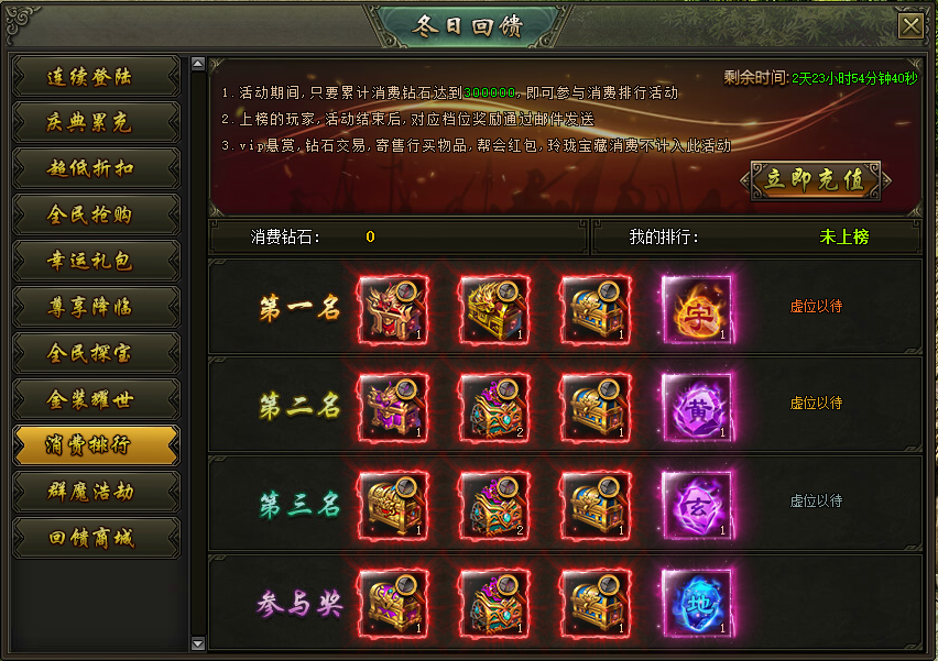 活动说明:活动期间,累计消费达到300000钻石的玩家参与排行,上榜的玩家奖励在活动结束后以邮件的方式进行发放