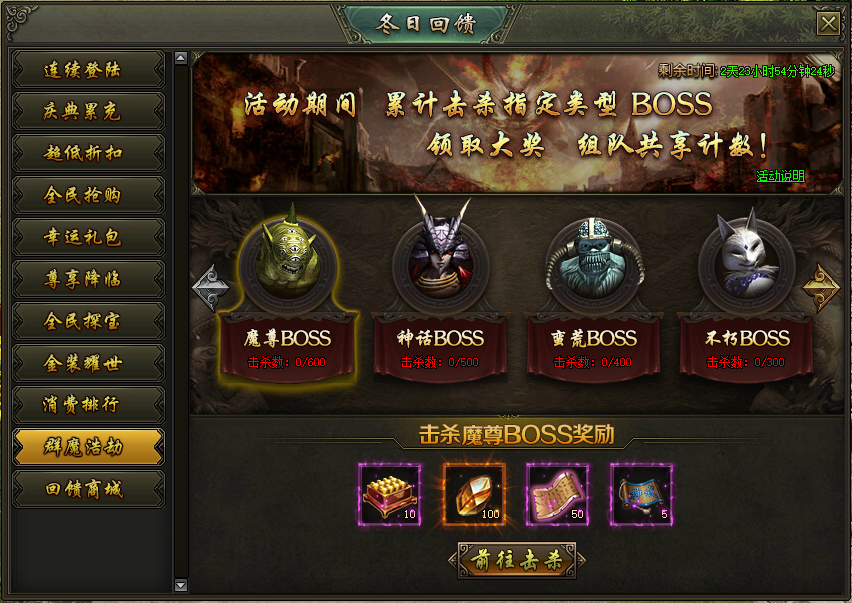 活动说明:活动期间,累计击杀指定类型BOSS,可领取超值奖励!