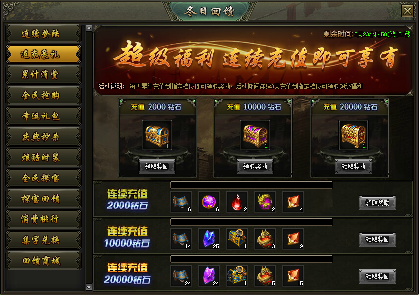 活动说明:活动期间,每天累计充值到指定档位即可领取对应奖励,连续充值3天可领取连充大奖