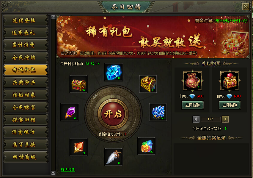 活动说明:活动期间,购买礼包获得抽奖次数,购买礼包次数和抽奖次数每日0点重置。
