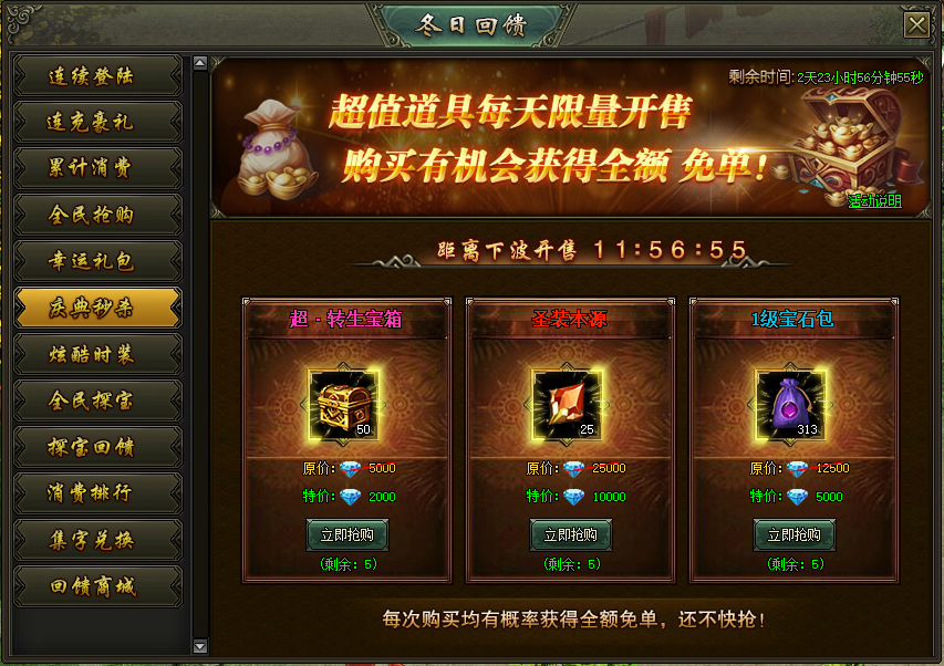 活动说明:活动期间,超值道具每天限量开售,购买就有机会获得全额免单!