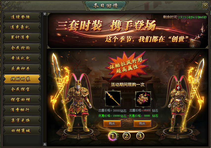 活动说明:活动期间,绝版时装限时出售,炫酷拉风外型、超高属性都在这里!