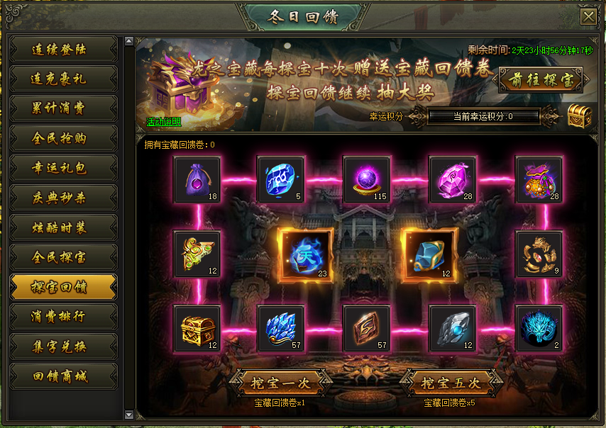 活动说明:活动期间,龙之宝藏每探宝十次赠送一张宝藏回馈卷,可继续在探宝回馈抽大奖