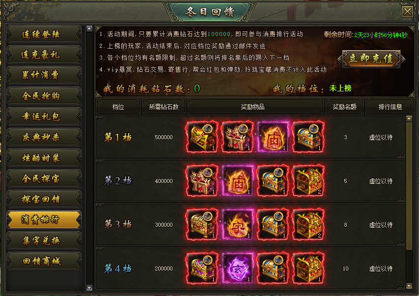 活动说明:活动期间,累计消费达到100000钻石的玩家参与排行,达到对应档位的玩家奖励在活动结束后以邮件的方式进行发放