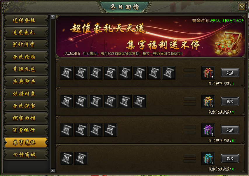 活动说明:活动期间,击杀BOSS有概率掉落字帖,集齐一定数量可兑换奖励!