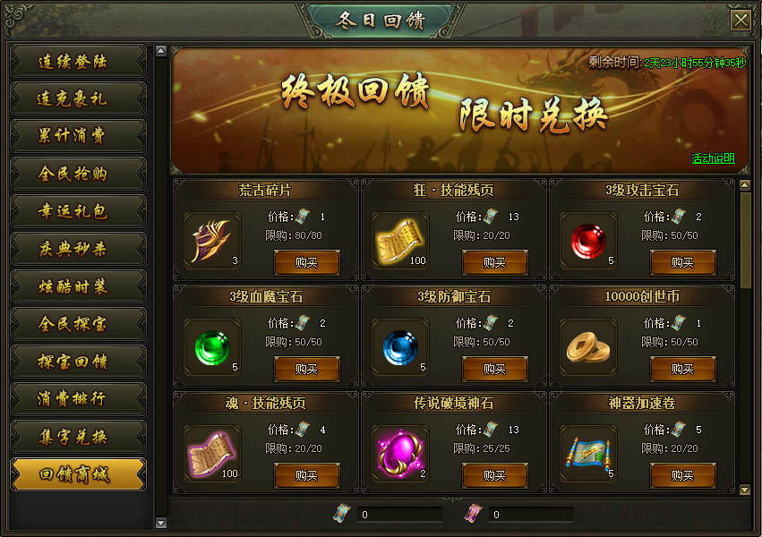 活动说明:活动期间,可使用充值回馈卷和消费回馈卷兑换大量奖励