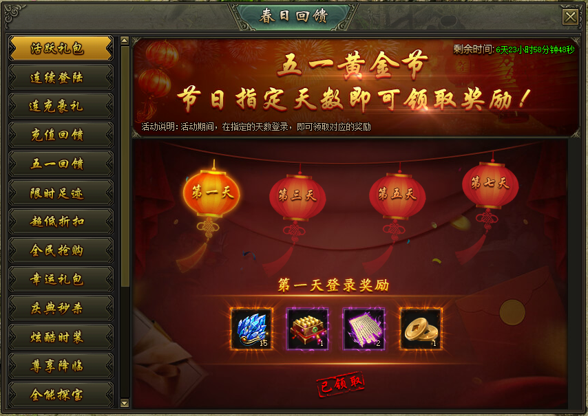 活动说明:活动期间,在指定天数登陆游戏,即可领取对应的奖励