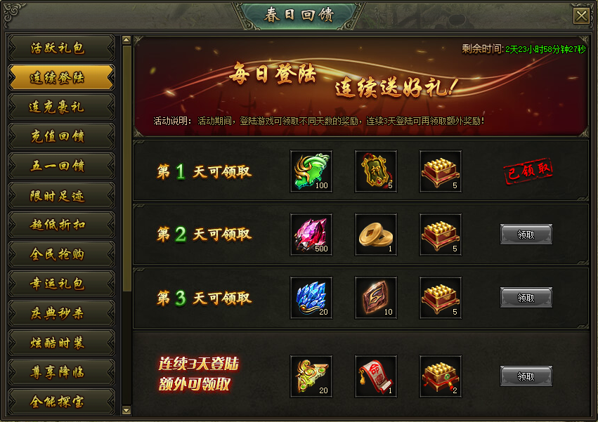 活动说明:活动期间,登陆游戏可领取不同天数的奖励,连续3天登陆可再领取额外奖励