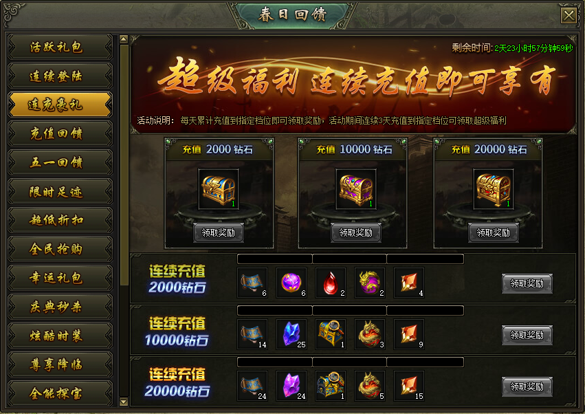活动说明:活动期间,每天累计充值到指定档位即可领取对应奖励,连续充值3天可领取连充大奖